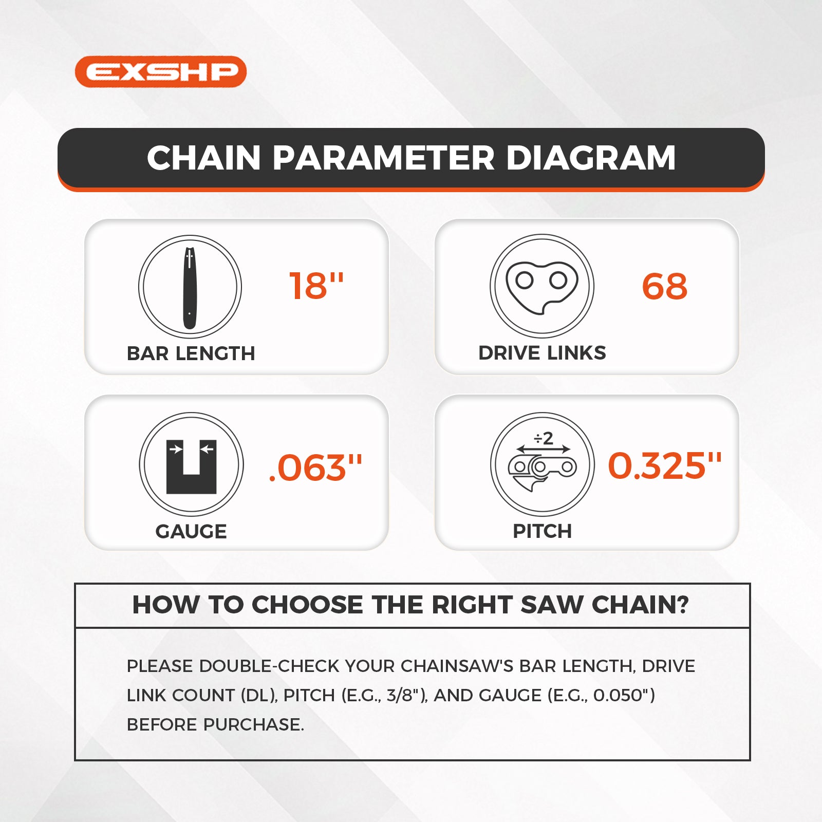 EXSHP Saw Chains | 18 Inch | .325" Pitch | .063" Gauge | 68 DL | Semi-Chisel | Low-Kickback